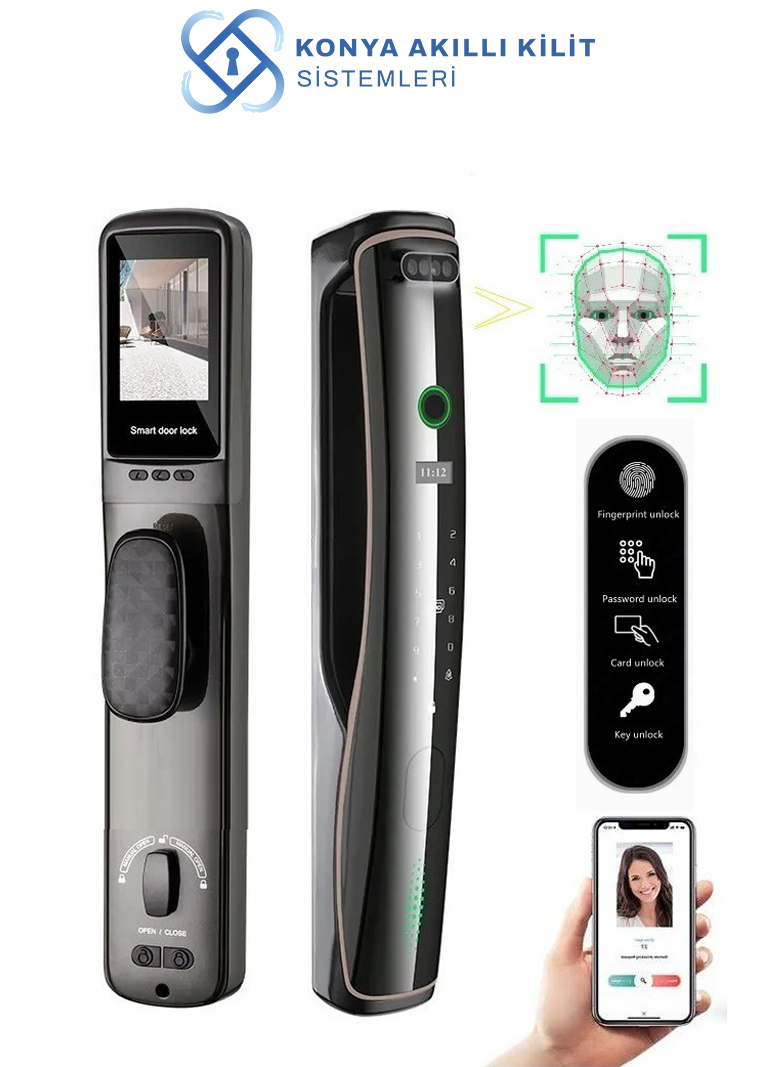 Full otomatik kapı kilit sistemidir. Çelik ve ahşap giriş kapılarına uygundur. WIFI uzaktan kapı açma özelliklidir. Çelik kapı otomatik kapı kilit sistemidir. Yüz tanıma parmak izi kart ve şifre kullanımı vardır. Siyah özel tasarım, gömme kilit seti dahildir. Lityum şarj edilebilir bataryalıdır. Değiştirilebilir pillidir ve emniyetlidir. Otomatik kilitleme özelliği vardır.